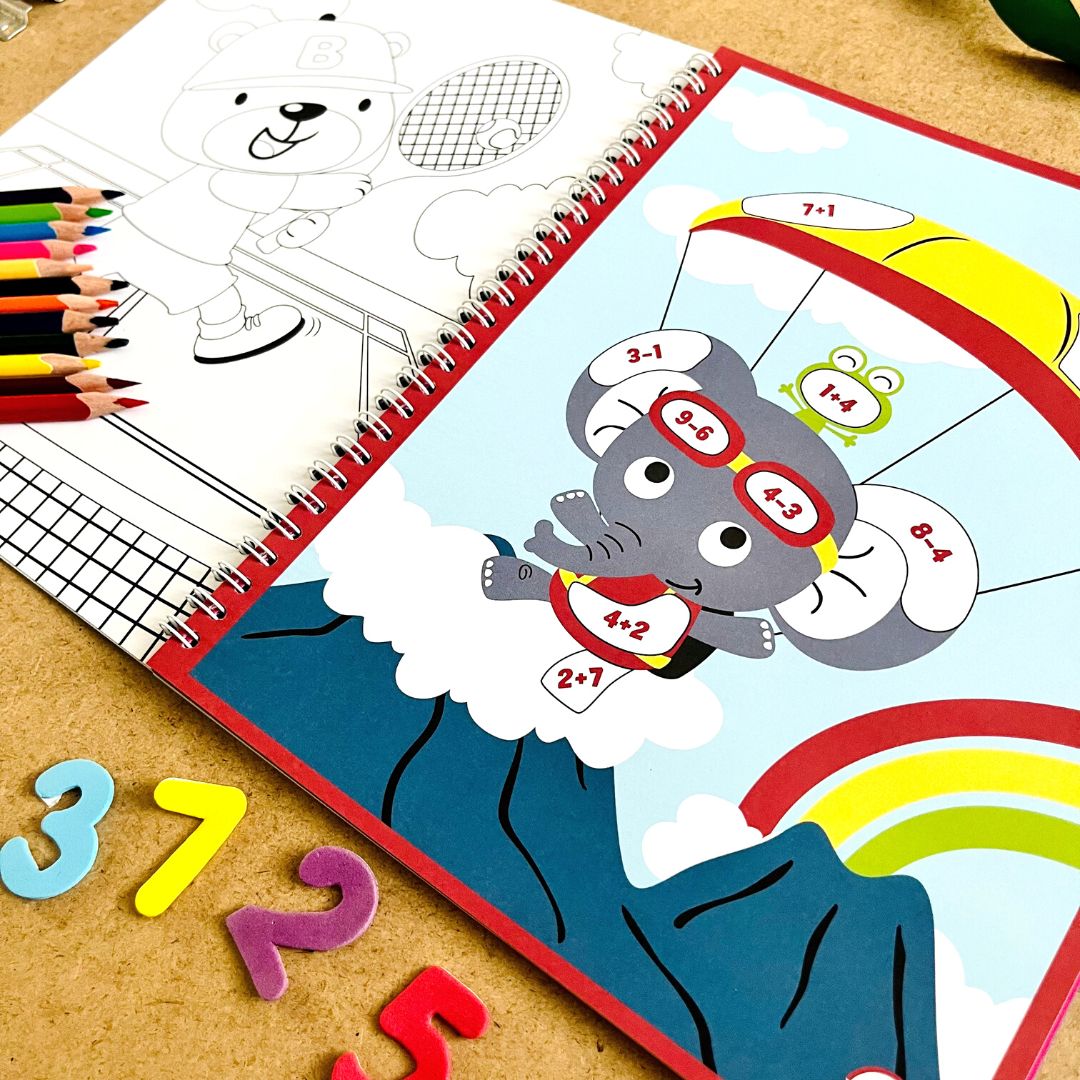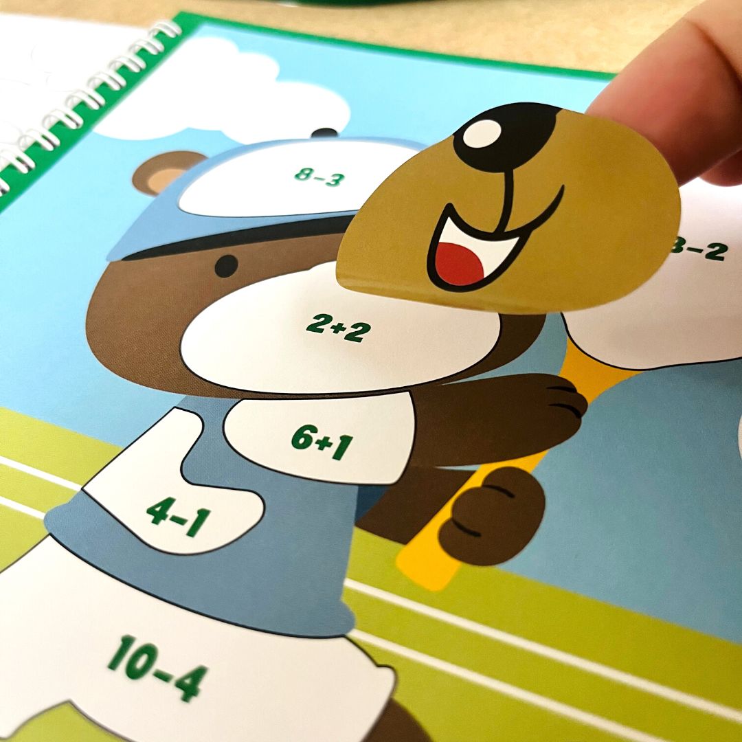 Vidám számolás 1-től 10-ig a matricáknak köszönhetően.Keresd meg, húzd le, ragaszd a megfelelő helyre, és egészítsd ki a képek hiányzó részeit! A számolás munkafüzet új szintre emeli az összeadást és a kivonást 1-től 10-ig. 15 hiányos képet tartalmaz vidám állatok motívumával és 5 lapot különböző formájú, méretű és színű, jól áttekinthető és könnyen lehúzható matricákkal. A gyermek feladata a példák megoldása, majd azok alapján a matricák felragasztása a képen látható megfelelő helyekre. Az összes matrica felragasztásával ő teszi teljessé a képeket,