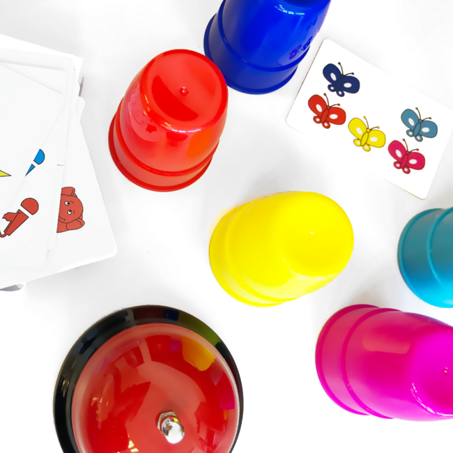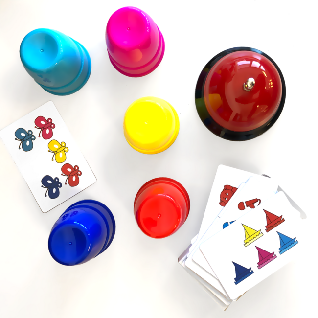 A játék tartalma: színes poharak, játékkártyák és egy csengő. 2–4 játékos részére.