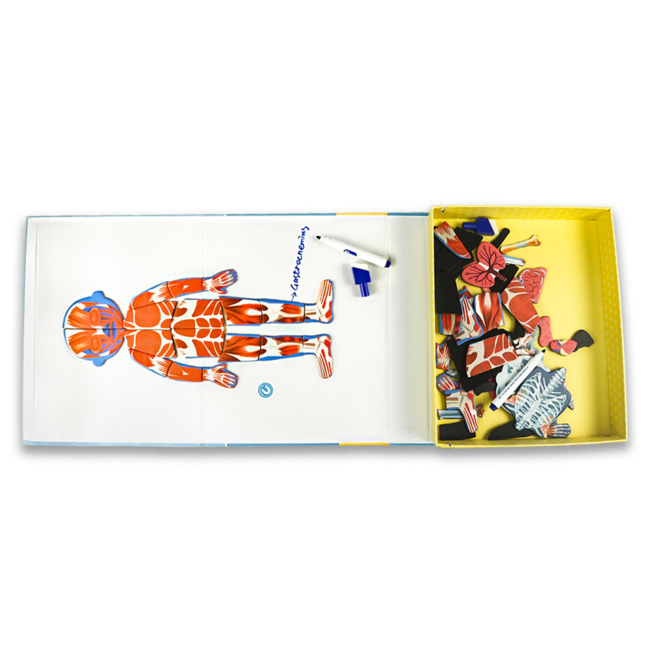 Mágneses puzzle – Az Emberi test nagyszerű eszköz minden kíváncsi gyermek számára. Tanulják meg együtt, hol vannak a különböző szervek, csontok vagy izmok a testünkben A dobozban összesen 42 mágneses kép és egy tábla található, amelyre rajzolni vagy írni lehet. Szórakozzanak, tanuljanak játékosan