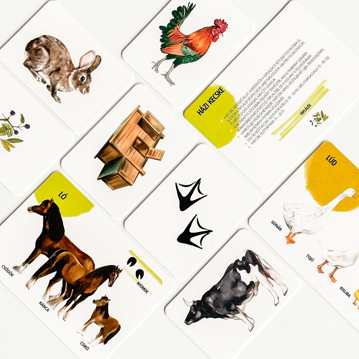 - 12 darab A6-os méretű kártyát (az előoldalon az állat neve, a hím, a nőstény, az ifjú egyed és a nyom, amit hagy; a hátoldalon rövid szöveg és az állat természetes tápláléka szerepel) a kártyák magyar nyelvű szöveget tartalmaznak