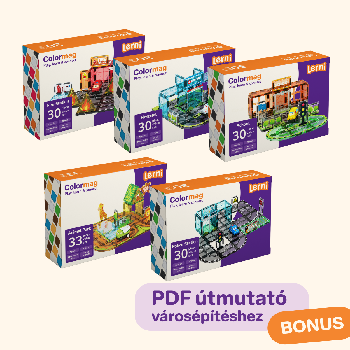 Építsd meg a saját nagyvárosodat, tele kalandokkal! Ez az exkluzív csomag tartalmazza a Colormag City sorozat összes szettjét - Rendőrség, Tűzoltóság, Kórház, Iskola és Állatpark. A gyerekek különféle épületeket alkothatnak, izgalmas történeteket találhatnak ki, miközben együttműködést, felelősséget és kreativitást tanulnak.